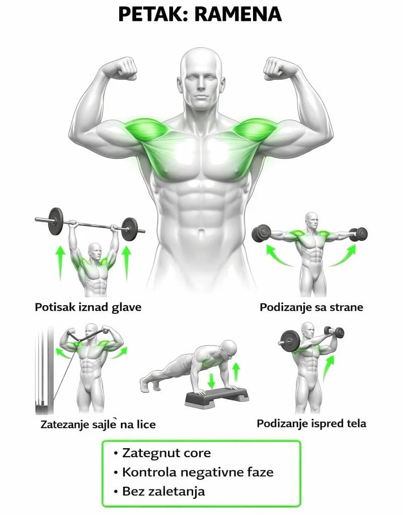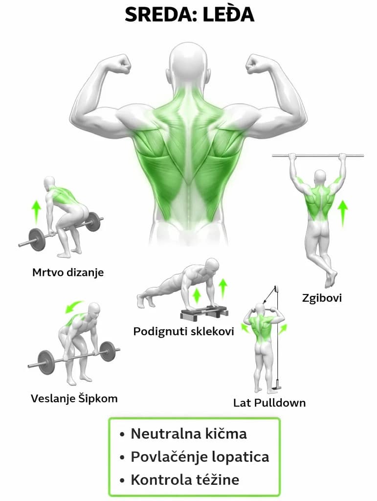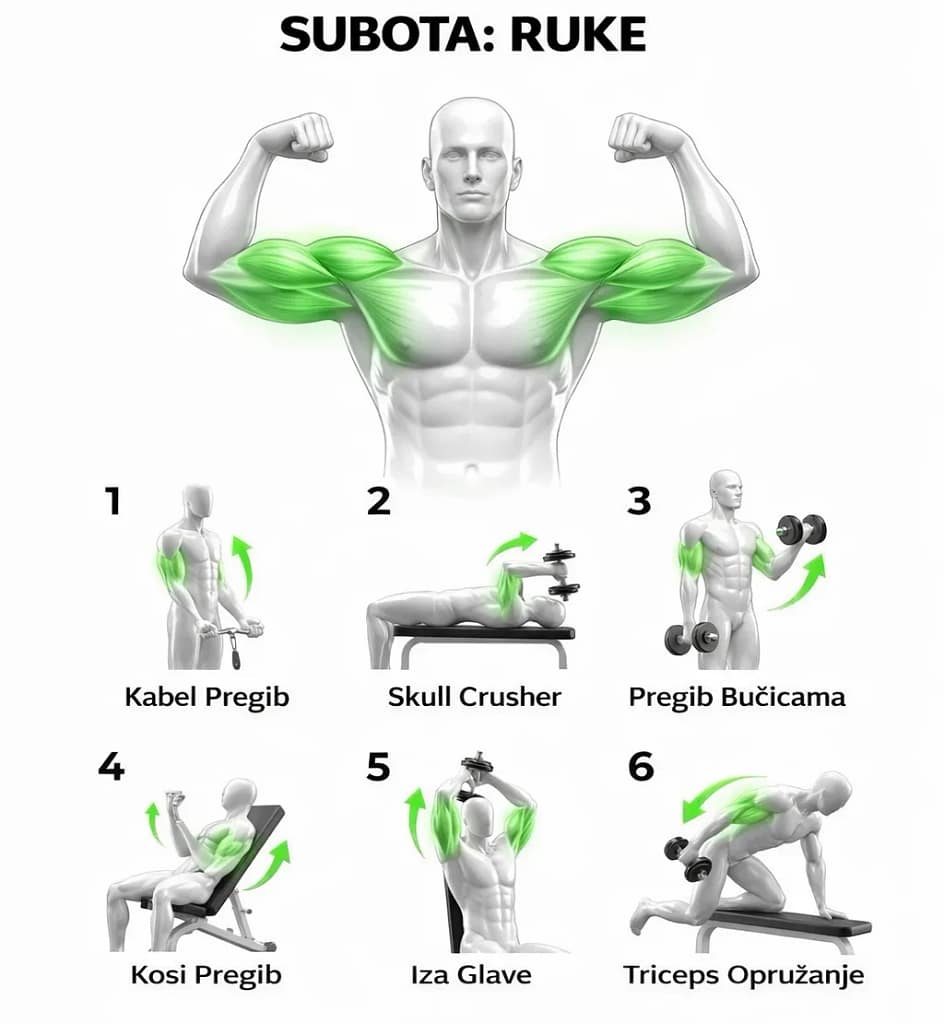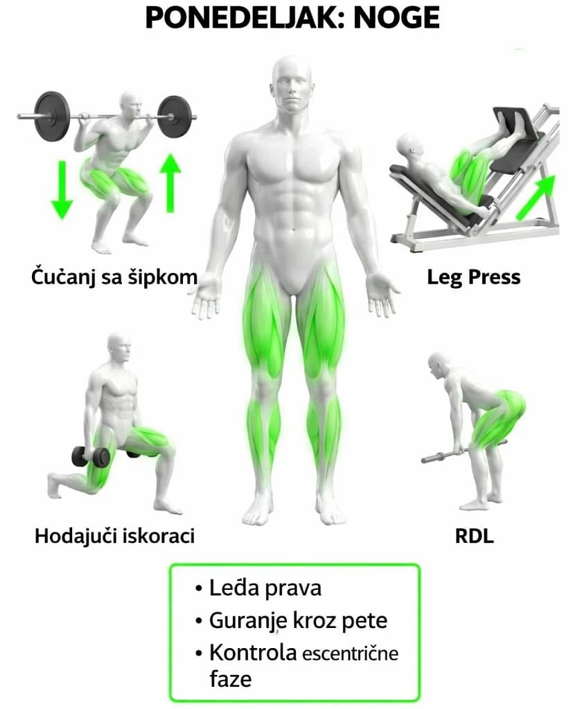 Svaki mišić dobija svoj dan. Fokus je maksimalan. Volumen je precizno raspoređen. Oporavak je kontrolisan.