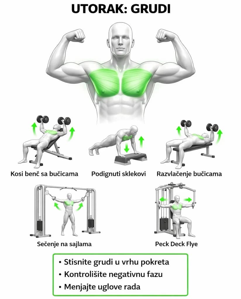 Grudi zahtevaju kontrolu, a ne ego. Ako bacate tegove – ne gradite mišić, već rizikujete povredu.