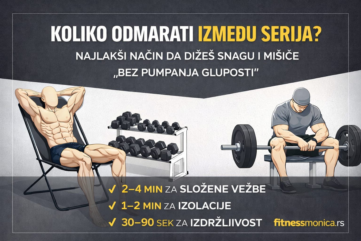 Ako postoji jedna stvar koju ljudi najčešće pogrešno shvate u teretani, to je pauza između serija. Većina ili odmara prekratko jer želi da “oseti pečenje”, ili odmara nasumično (kopira nekog jačeg bez konteksta). A istina je jednostavna: pauza je alat, isto kao težina na šipci i broj ponavljanja. Kad je podesiš pametno, imaš više snage u svakoj seriji, više kvalitetnog volumena i bolji napredak — bez jurnjave za umorom.