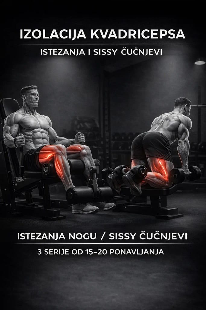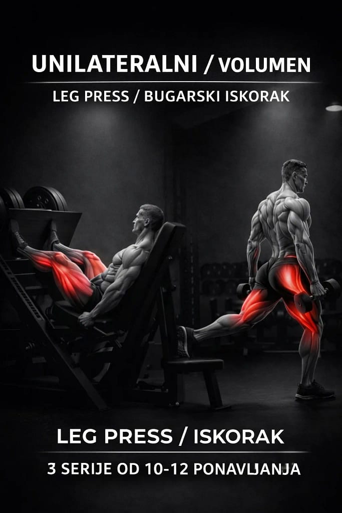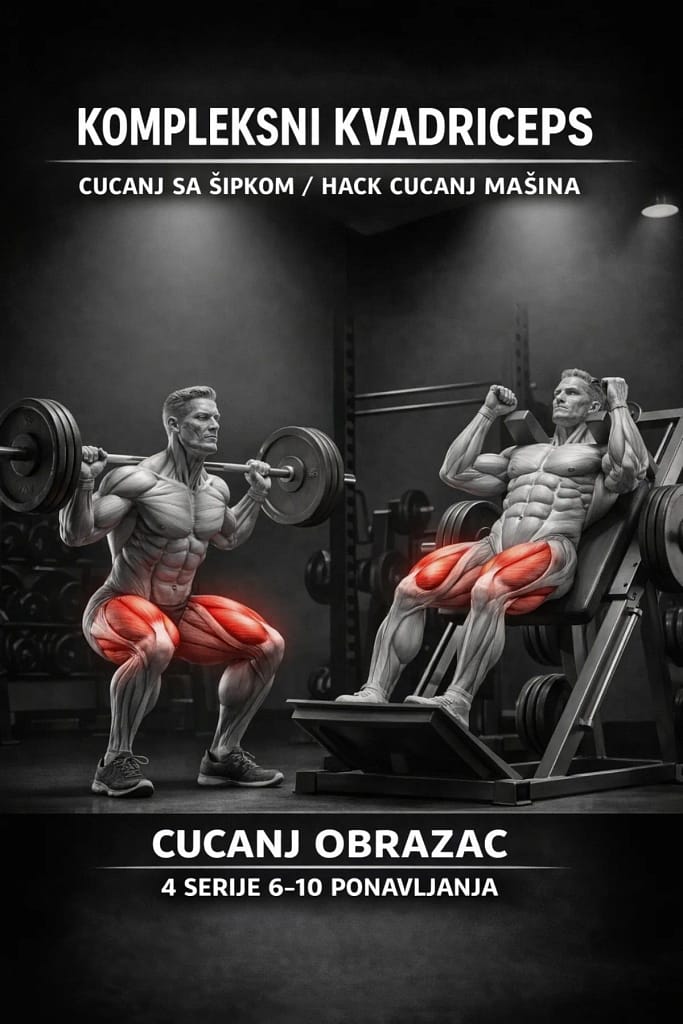 Ako želiš ozbiljne noge – jake, guste, funkcionalne i estetski razvijene – moraš da prestaneš da komplikuješ trening. Nema potrebe za 12 različitih vežbi, superserijama bez smisla i haotičnim redosledom. Postoji jasna struktura koja pogađa svako mišićno vlakno kvadricepsa i zadnje lože – i to iz produženog i skraćenog položaja.